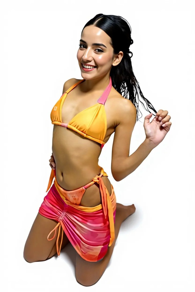 - Mini beach skirt with a gathered front. In a vibrant orange-yellow hue, this set captures the energy of the sun and flatters all figures.